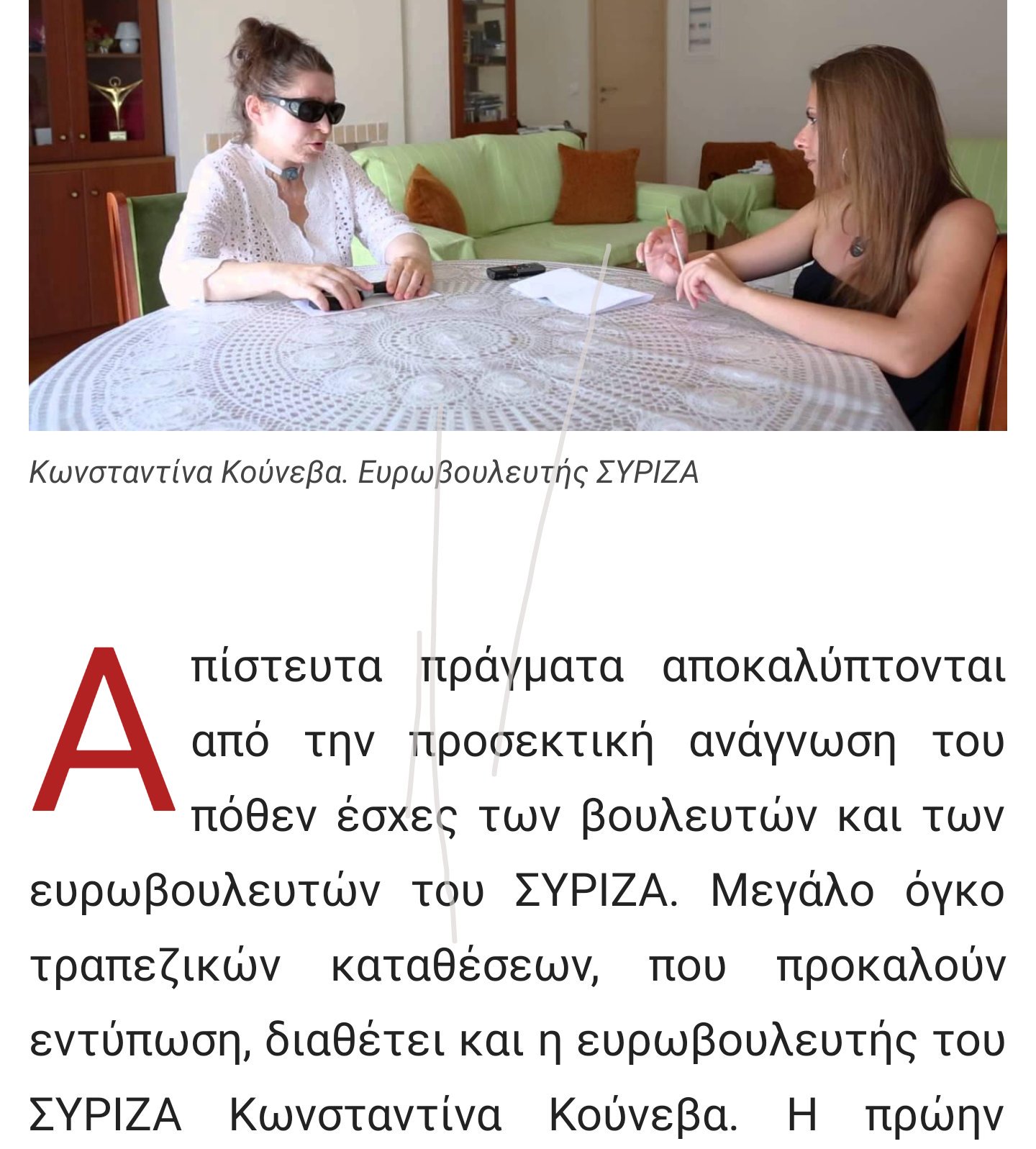 Μεγάλο όγκο τραπεζικών καταθέσεων,που προκαλούν εντύπωση,διαθέτει η ευρωβουλευτής του ΣΥΡΙΖΑ Κωνσταντίνα Κούνεβα,πρώην καθαρίστρια...